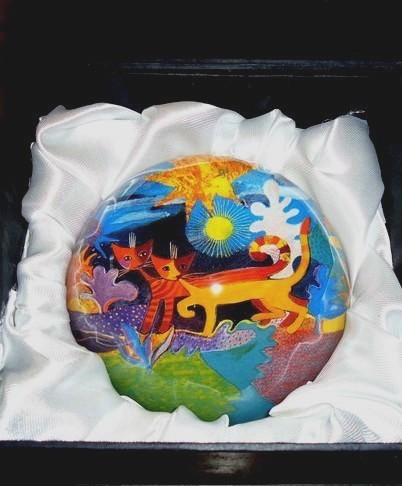 farbenfroher Briefbeschwerer aus Kristallglas in schwarzer Geschenkverpackung mit Sichtfenster, aus dem Hause Goebel.