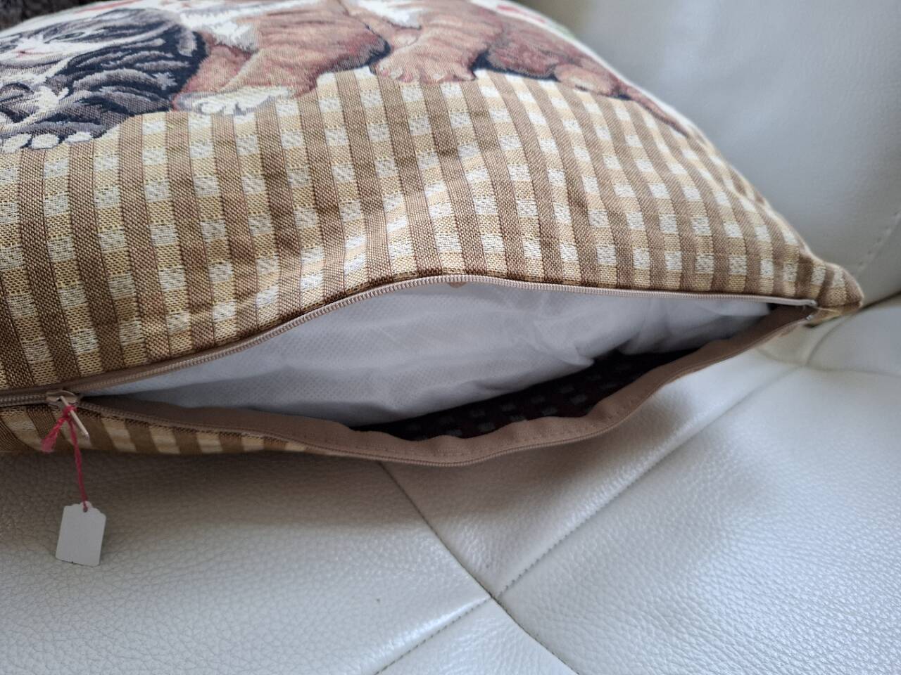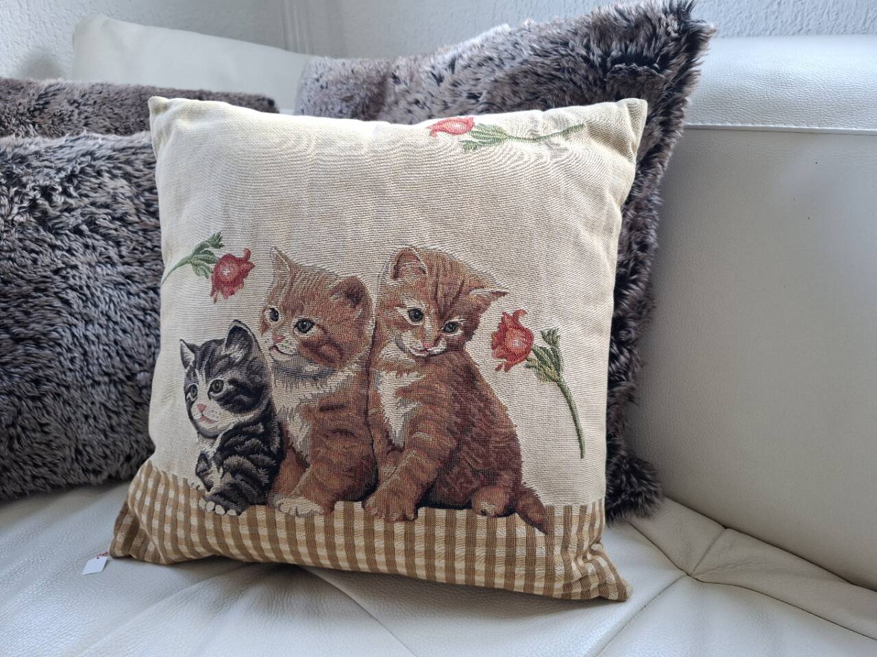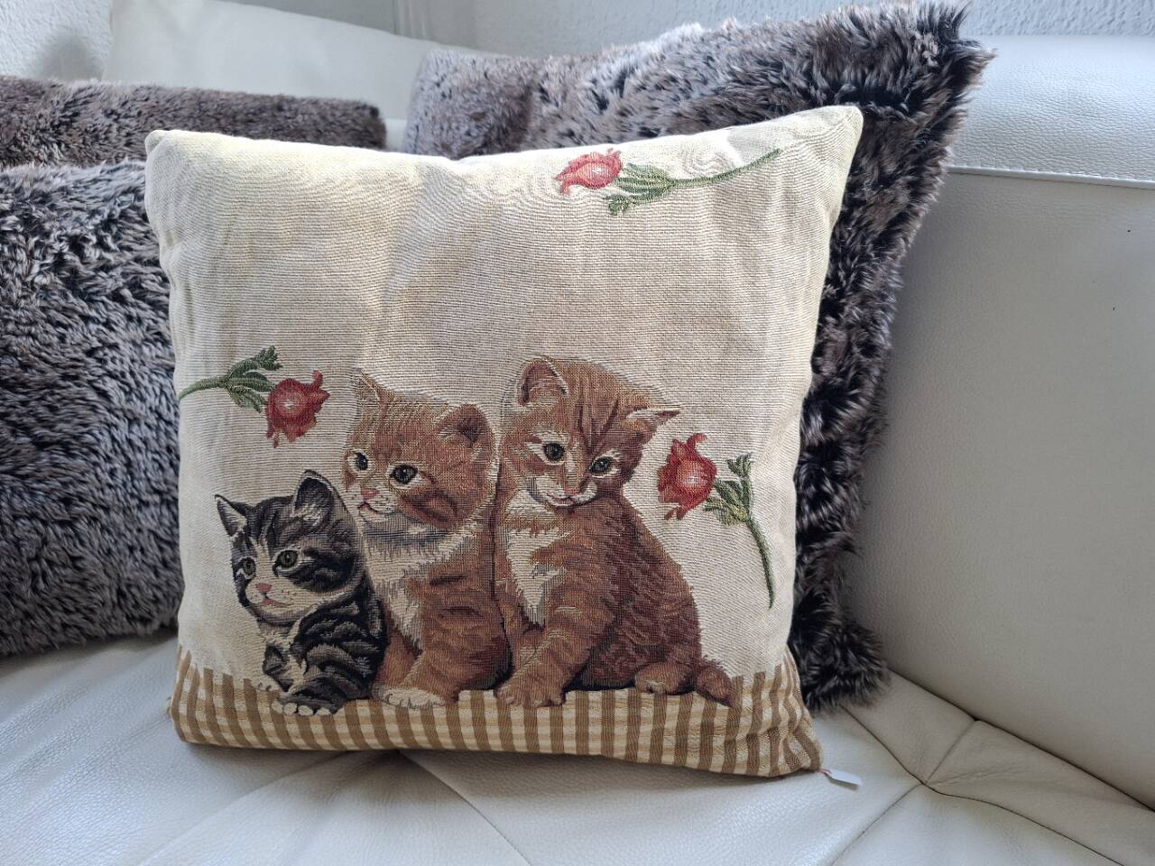 schöner Dekorationsstoff im Leinen-Stil, vorne und hinten das gleichgewobene Motiv, unten mit Reissverschluss und herausnehmbarem Kissen.