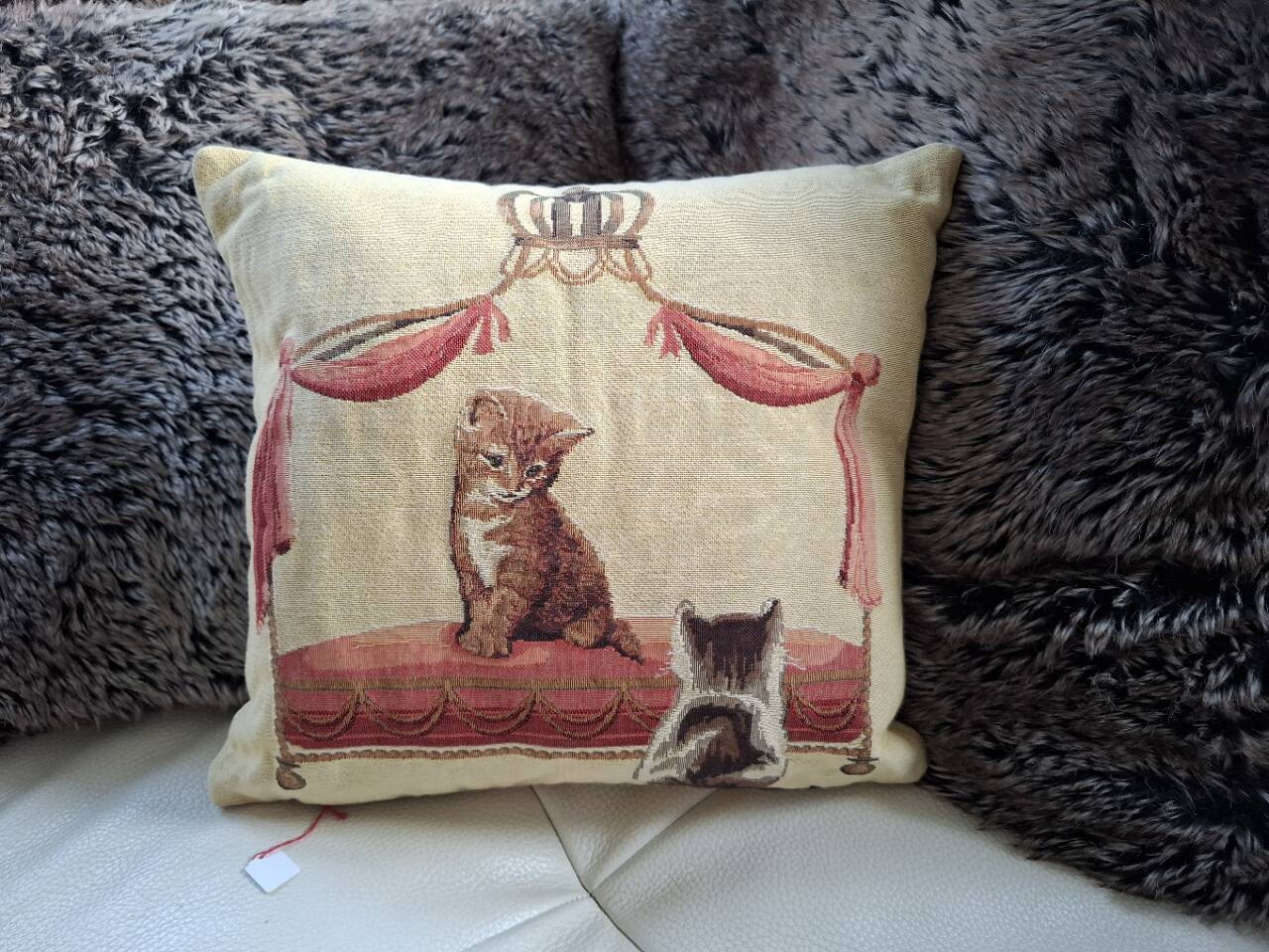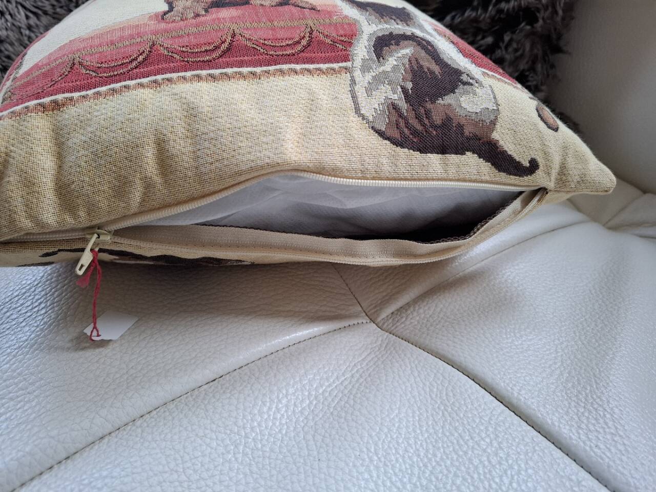 schöner Dekorationsstoff im Leinen-Stil, vorne und hinten das gleichgewobene Motiv, unten mit Reissverschluss und herausnehmbarem Kissen.